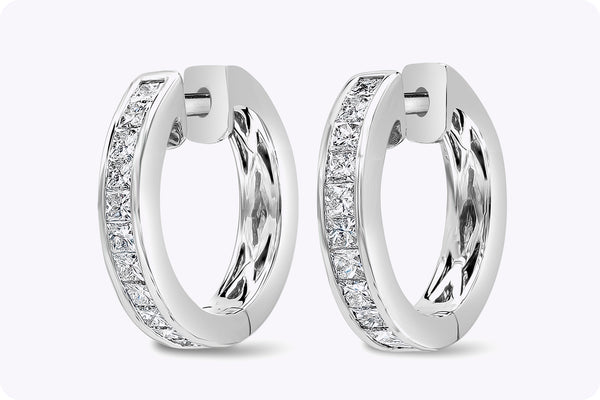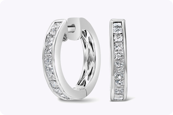 A simple pair of hoop earrings showcasing a row of 22 princess cut diamonds, channel set in an 18k white gold mounting. Diamonds weigh 0.50 carats total, F color and VS in clarity.
