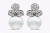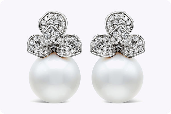 This beautiful earrings are showcasing 13-14 mm south sea pearls. Earrings consist of 96 round cut diamonds weighing 0.98 carats total, suspended on a diamond encrusted flower design. Made with 18K White Gold
