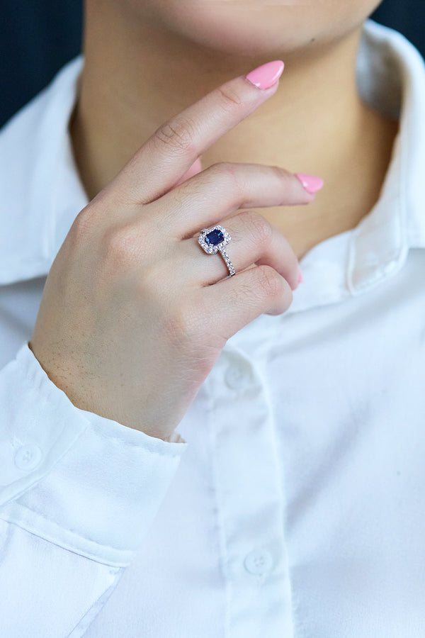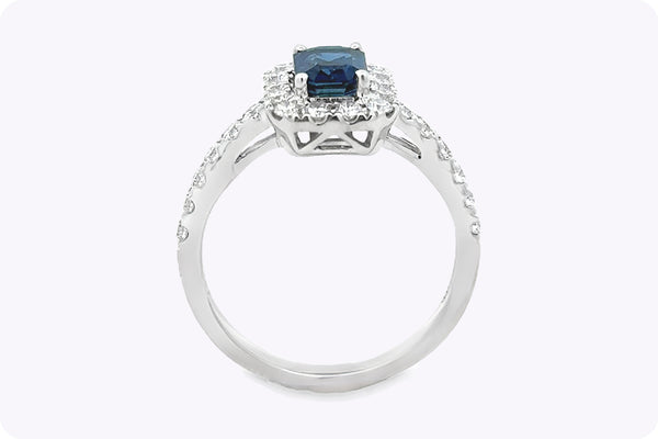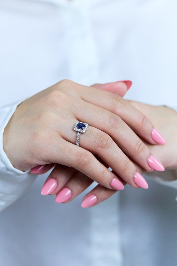 1.03 Carats Emerald Cut Sapphire & Diamond Halo Engagement Ring in White Gold