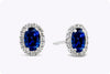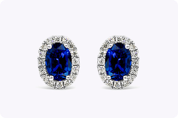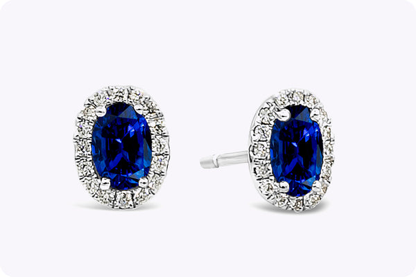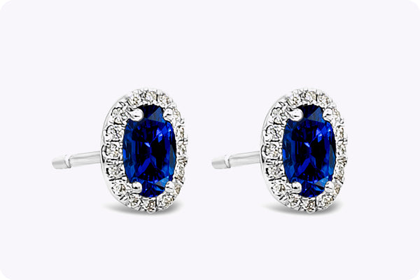 An appealing pair of stud earrings showcasing oval cut blue sapphires weighing 1.19 carats total, surrounded by a row of brilliant round diamonds in a halo design weighing 0.16 carats. Made in 18K White Gold.