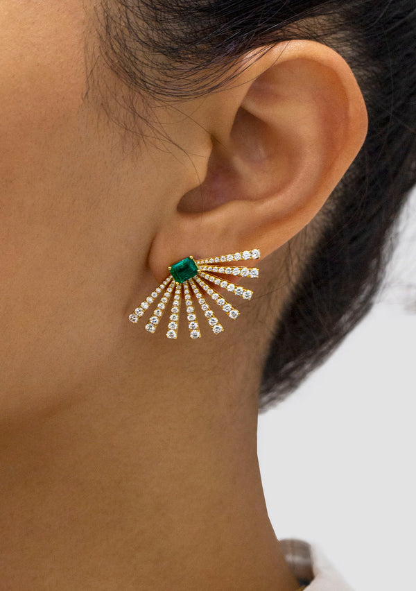 A statement and unique pair of earrings showcasing 2 Emerald Cut Green Emerald Stone weighing 1.25 carats total. Accented with round brilliant diamonds weighing 1.93 carats total, F Color and VS-SI in Clarity. Set in a fashion open-work design. Made with 18K Yellow Gold.