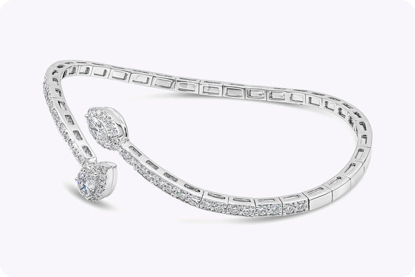 A unique and fashionable cuff bracelet showcasing a wave design set with brilliant diamonds. On the end of the cuff is a pear shape diamond halo, and a marquise cut diamond halo. Diamonds weigh 1.30 carats total. Made with 14K White Gold