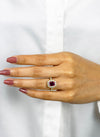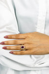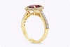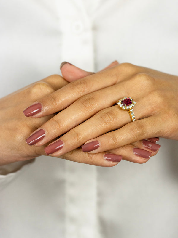 A timeless engagement ring style showcasing a vibrant purplish-red emerald cut rubellite weighing 1.58 carats total, set in a classic four prong basket setting. Surrounded by a single row of round brilliant diamonds weighing 1.10 carats total. Set in a diamond encrusted band made in 18K yellow gold.