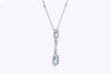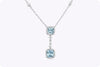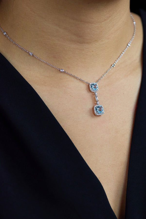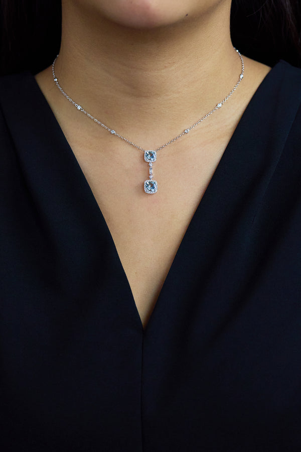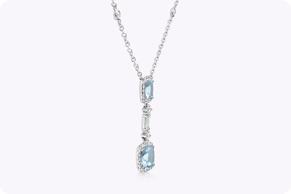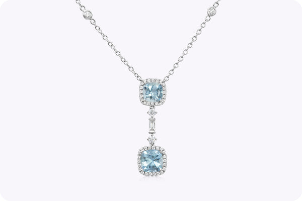 A stunning pendant necklace, showcasing two cushion cut aquamarines weighing 1.96 carats total, both surrounded by a halo of round cut diamonds. Accented by a line of two round and baguette cut diamonds, connecting the two aquamarines together. Chain features a diamonds by the yard design. Accent diamonds weigh 0.75 carat total. Finely made with 18K white gold, 16 inches in length. Perfect for formal wear.