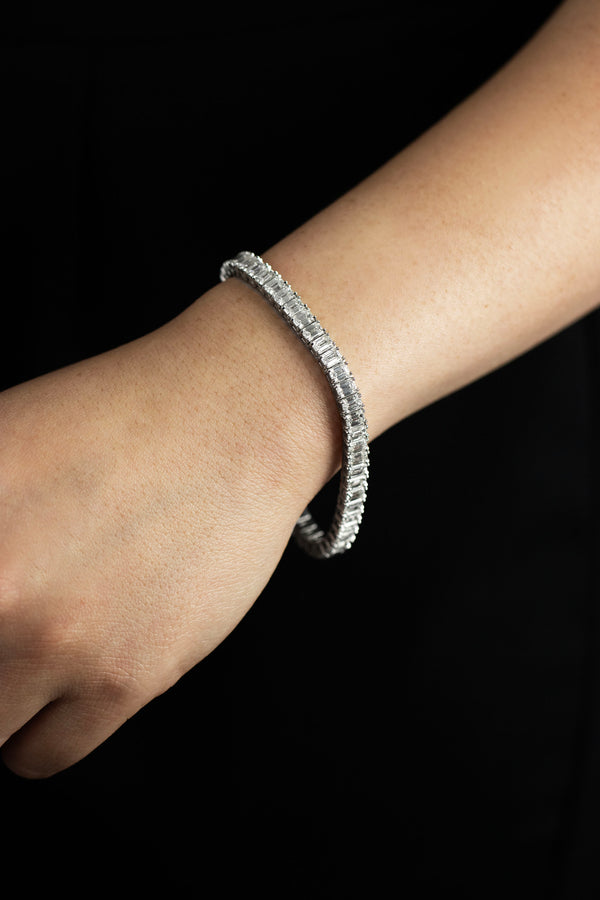 A classy and unique tennis bracelet showcasing a row of beautiful perfectly matched emerald cut diamonds weighing 16.06 carats total, G-H Color and VS-VVS in Clarity. Set in a classic four-prong basket setting, made with platinum, 7 inches in length.