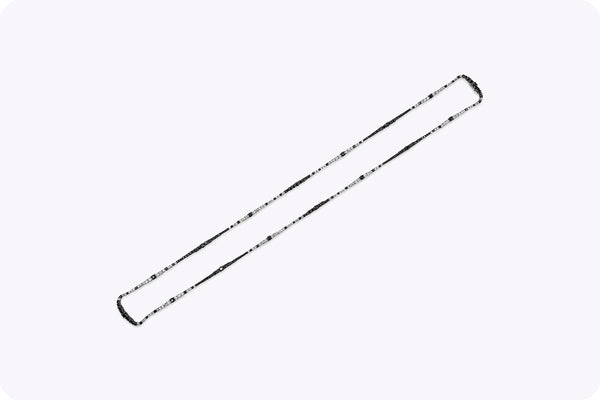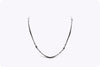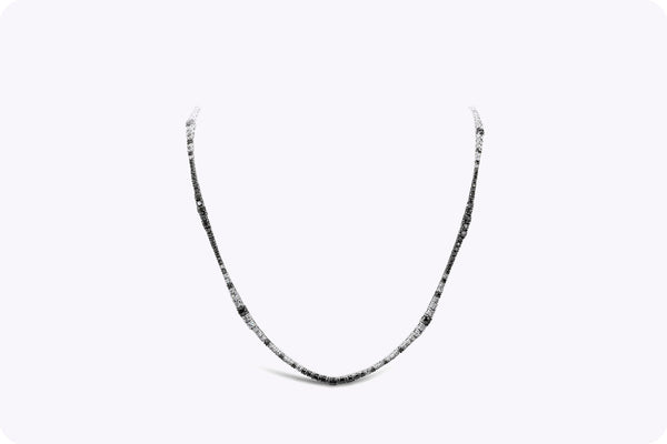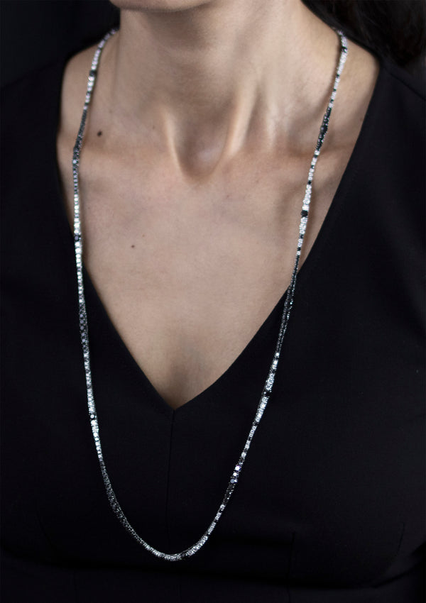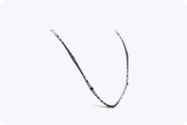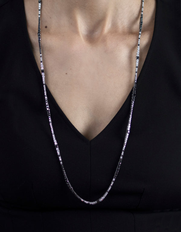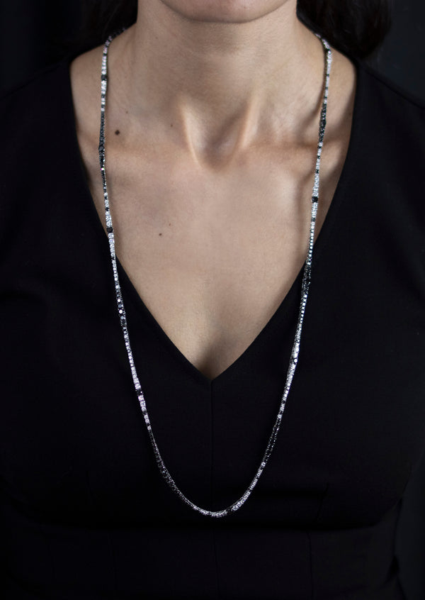 A brilliant long riviera necklace showcasing a row of white and black round diamonds, White diamonds weigh 7.77 carats total and Black diamonds weigh 14.77 carats total. Made with 18K White Gold. 32 3/4 inches in Length