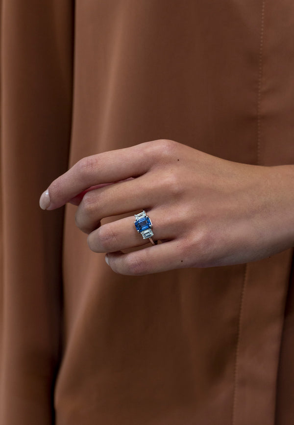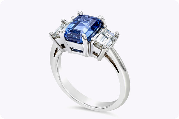 GIA Certified 3.25 Carats Emerald Cut Blue Sapphire Three-Stone Engagement Ring in Platinum