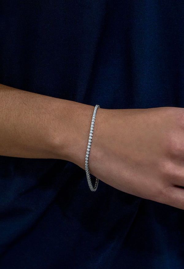 A classic tennis bracelet style showcasing 62 round brilliant diamonds, Diamonds weigh 4.03 carats total and are approximately F color, VS-SI clarity. 7 inches in Length. 2.50mm in Width. Made in 18K White Gold