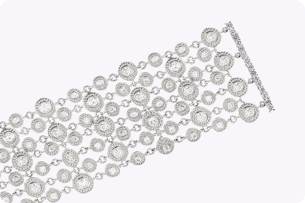 An antique style bracelet showcasing 7 rows of sparkling round diamonds evenly-spaced in a 7 inch 18k white gold mounting. Each diamond set in an intricate bezel designed with beaded edges to give it that antique look. Diamonds weigh 6.58 carats total.