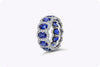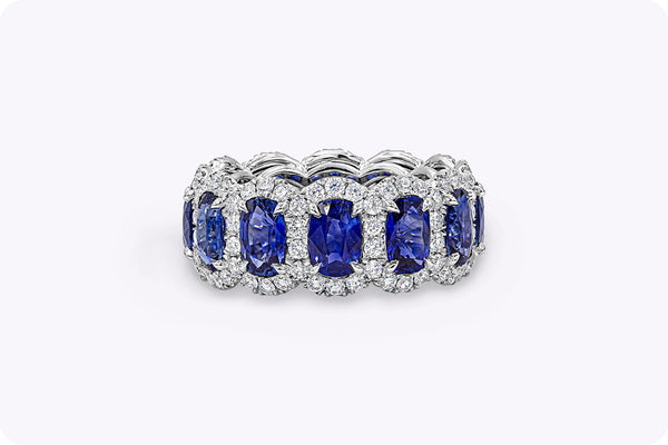 A elegant and grand eternity wedding band style showcasing oval cut blue sapphires, surrounded by brilliant round diamonds in a halo design, set in a classic four prong open gallery setting. Blue sapphires weighs 7.63 carats total, and Diamonds weighs 1.56 carats total. Made in 18K White Gold, Size 6 US