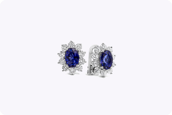 These classic earrings feature oval cut blue sapphires weighing 4.13 carats total, surrounded by a single row of round brilliant diamonds. Set in a floral motif design. Diamonds weigh 1.75 carats total. Omega Clip with post.
